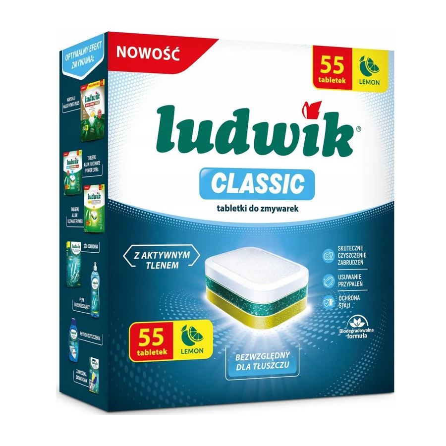 A LUDWIK CLASSIC mosogatógép tabletták innovatív, biológiailag lebomló, AKTÍV OXIGÉNT TARTALMAZÓ formulával rendelkeznek, amely lúgos szerekkel és enzimekkel együttműködve könyörtelenül küzd a zsírral, áztatás nélkül eltávolítja a szennyeződéseket, és megakadályozza a rozsdamentes acél mattságát és korrózióját.